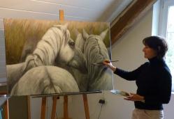 Fast täglich beobachtet die Malerin Verhaltensweisen innerhalb der Herde. Dabei entstehen viele Studien und Skizzen auf ihren Weiden und in Gestüten verschiedener Pferderassen.