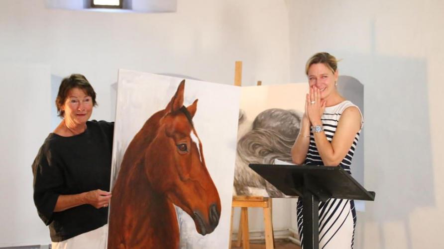 Die Benders habe sie kennengelernt, als sie wegen eines Beitrags für die Sendung »Hessentipp« über die Veranstaltung »Kunst und Kürbis« in Villingen war. Man verstand sich auf Anhieb. »Kein Tier berührt mehr als ein Pferd«, machte die »Wetterfee« und »Alle Wetter«-Reporterin deutlich, und: »Pferde kommunizieren mit dem ganzen Körper, sie blasen sich gegenseitig in die Nüstern als Ausdruck von Freundschaft, Gesicht an Gesicht ist eine Freundschaftsgeste, sie kommunizieren mit dem Ohrenspiel« – all dies halte Christine Bender in liebevoller Kleinstarbeit feinfühlig fest. »Ein minimaler Ausdruck von Pferden kann uns verzaubern«, so Kie-nast. Seit sie vier Jahre alt ist, sei sie selbst vom Pferdevirus infiziert. Sie könne sich kein Leben ohne die Tiere und ihr eigenes Pferd Capral vorstellen. Was Laudatorin Kienast nicht wusste war, dass Christine Bender heimlich Capral besucht und ein Gemälde von ihm als Dankeschön angefertigt hatte. Als sie dies überreichte, standen der überraschten HR-Moderatorin Tränen der Rührung in den Augen. (Foto: nab)